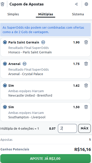 Na parte final, em Múltipla de 4-Seleções = 1, há o valor da cotação multiplicada de todas essas 4 seleções, que é de 8,07. O valor de 2 significa R$2 e ao apostar este valor na cotação 8,07 o retorno total é de R$16,16.