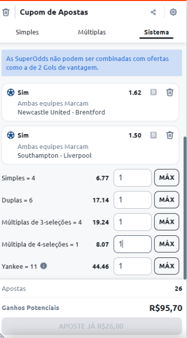 Ao selecionar sistema aparecerá todas as opções disponíveis de apostas que você pode fazer com aquelas 4 seleções. Por exemplo: