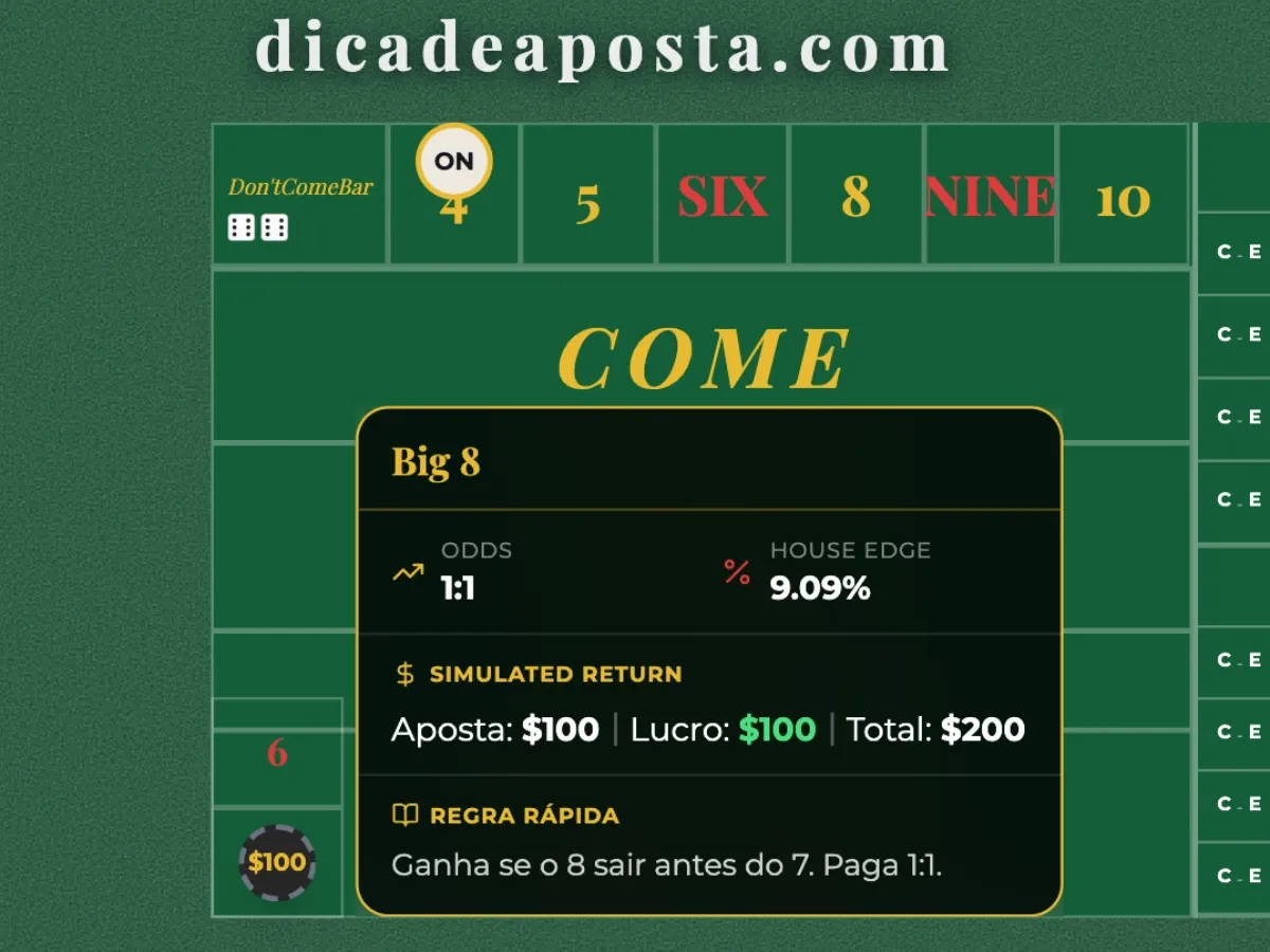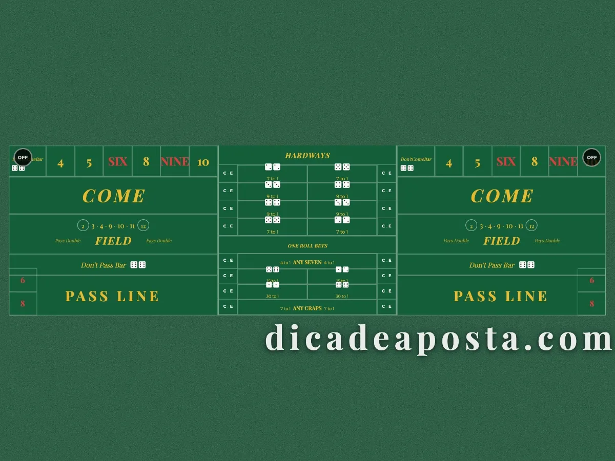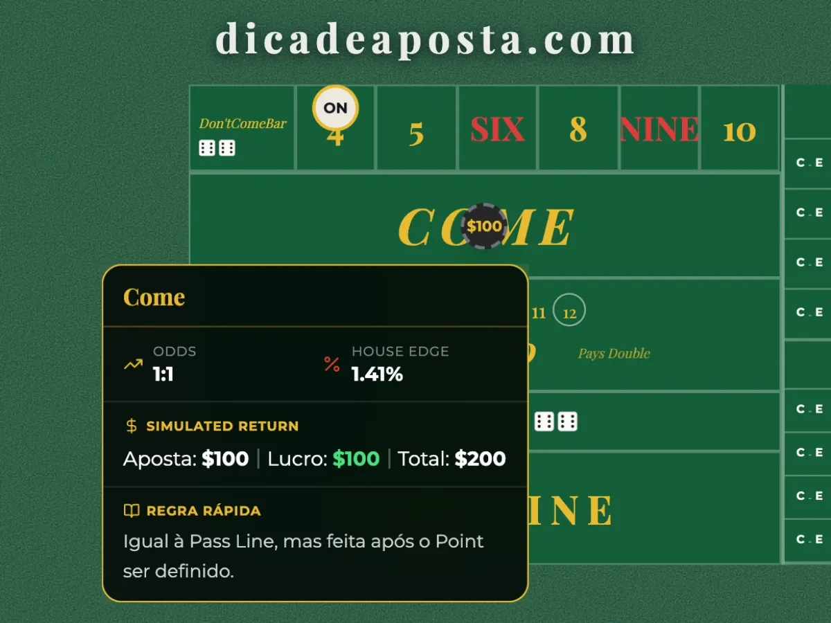Come: Pode ser feita somente após o point e funciona como o Pass Line: se sair 7 ou 11, você ganha; se for 2, 3 ou 12, perde. Caso outro número apareça, ele vira seu novo “point pessoal”, e você precisa que ele saia antes do 7 para vencer.