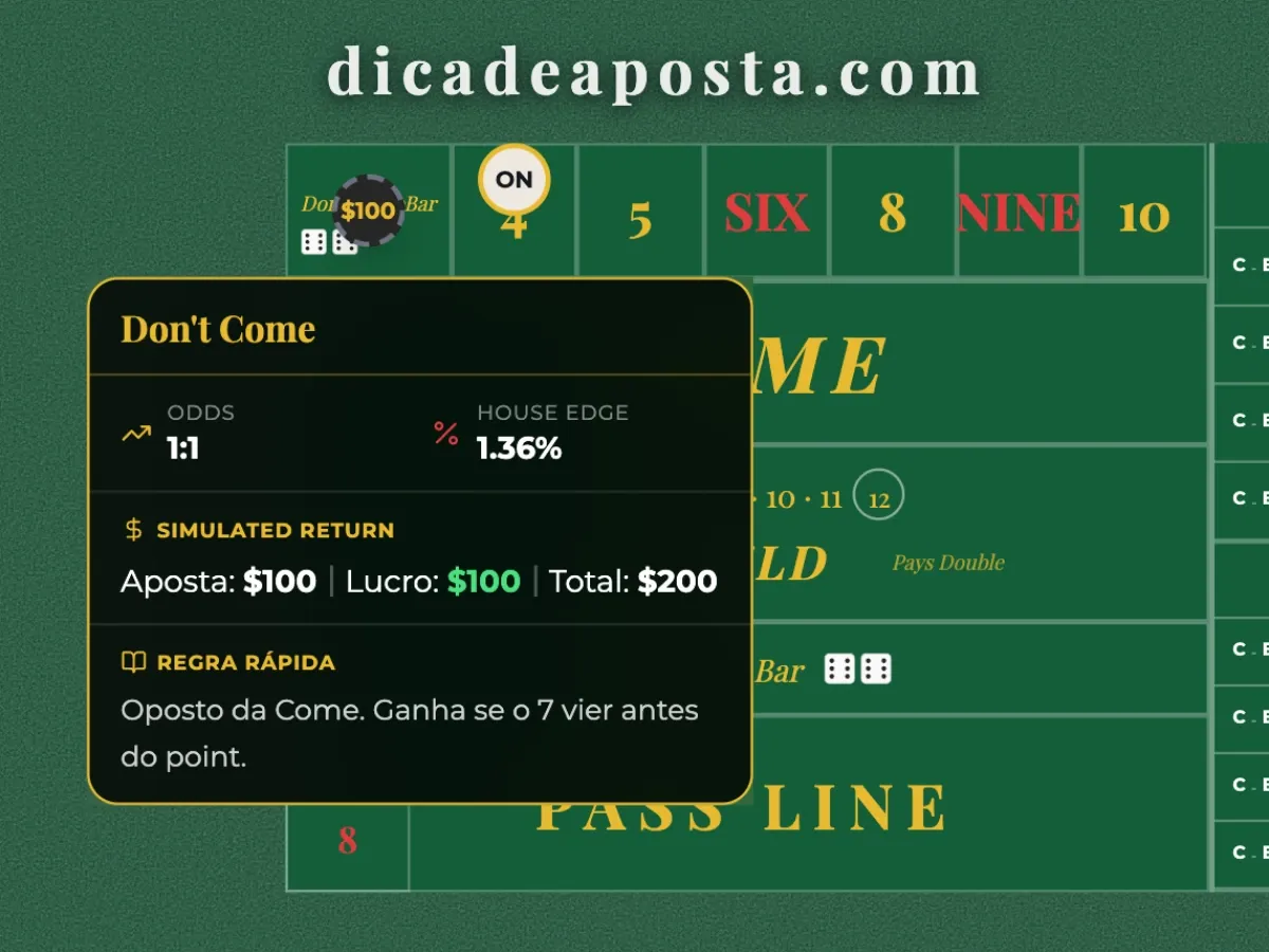Don’t Come: Também pode ser feita somente após o point e você vence com 2 ou 3, perde com 7 ou 11, anula com 12, mas se um número virar seu point pessoal, você torce para o 7 sair antes dele.