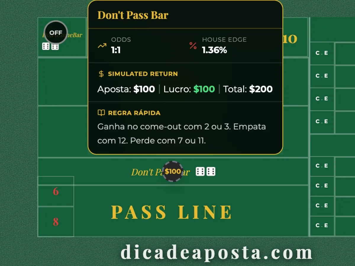 Don’t Pass: O oposto da Pass Line. Vence com 2 ou 3, anula com 12 e perde com 7 ou 11. Se um point for estabelecido, você vai precisar que um 7 saia antes do point novamente.