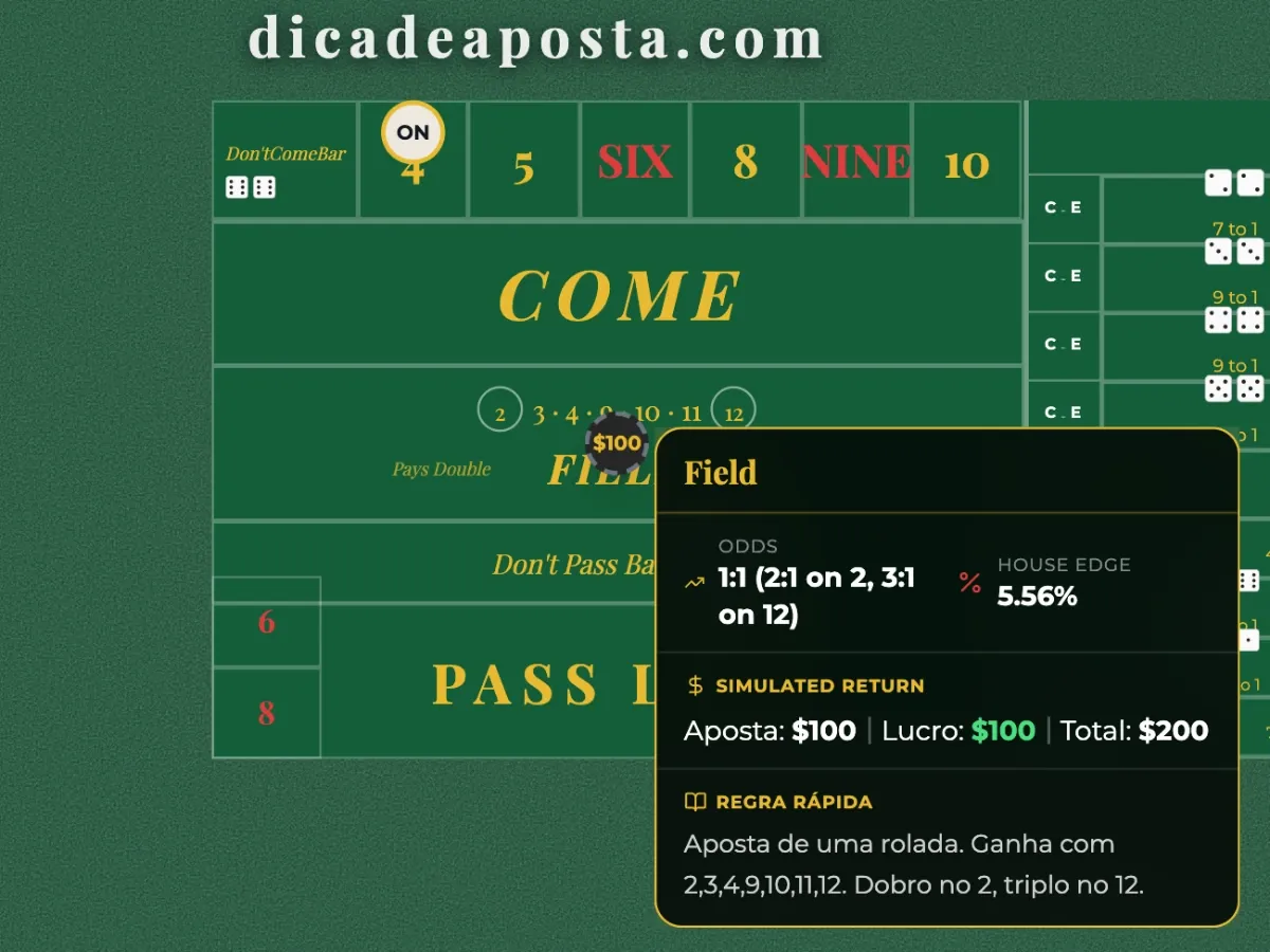 | Field Bet | Próximo lançamento: 2, 3, 4, 9, 10, 11 ou 12 | 1:1 (2:1 para 2/12) |
