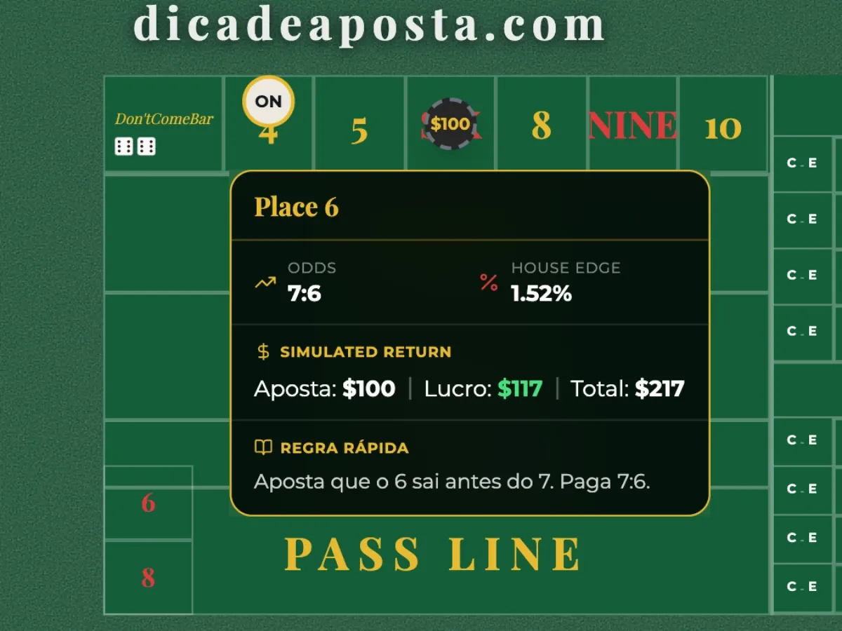 | Place Bets | O número escolhido (4, 5, 6, 8, 9, 10) antes de um 7 | Varia (ver acima) |
