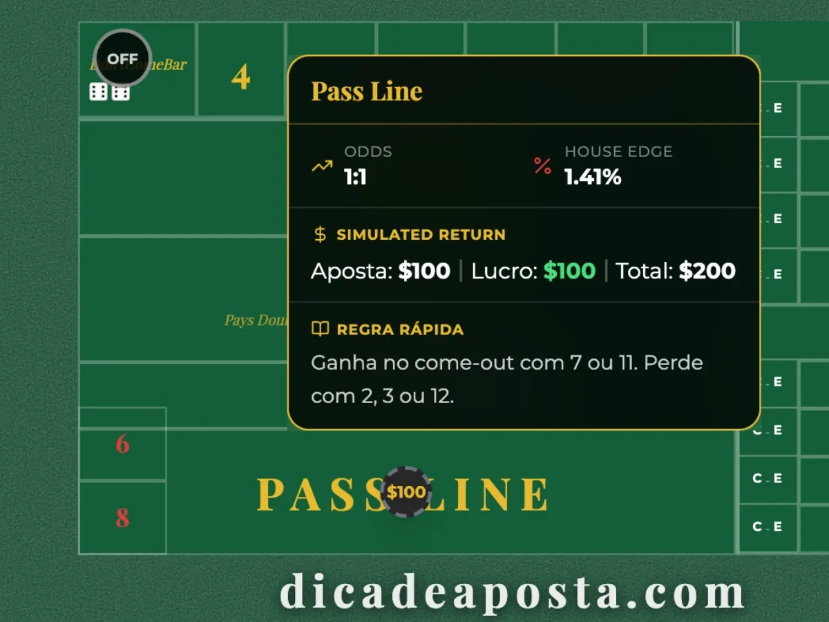Pass Line: Vence com 7 ou 11 no come-out e perde com 2, 3 ou 12. Se houver point as coisas mudam, você segue vivo, mas você precisa que um point seja jogado antes antes de um 7 para ganhar.