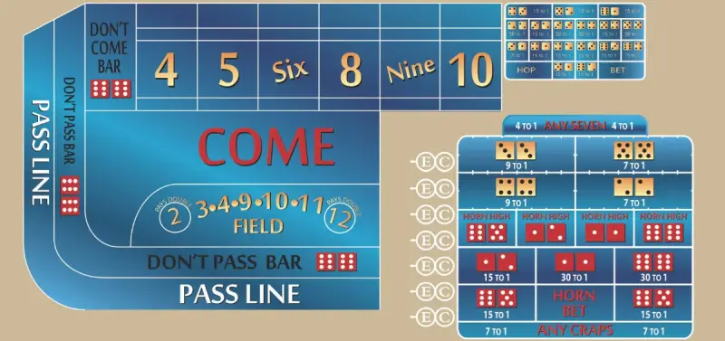 O layout da mesa de Craps reflete todas as opções de apostas disponíveis, e entender cada elemento é essencial para jogar sem cometer erros. Abaixo, você encontrará uma imagem seguida de uma explicação detalhada dos componentes que compõem a mesa. No entanto, nesta página, não vamos nos aprofundar nas apostas – apenas daremos uma visão geral.