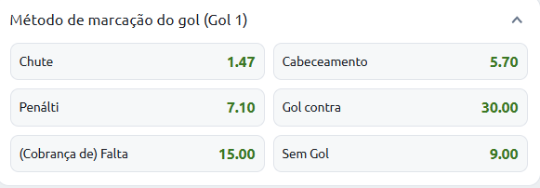 Essas são apostas extremamente estranhas de acontecer. Veja a imagem acima por exemplo. Nela a aposta é apontar qual o método do primeiro gol: chute, cabeça, pênalti, gol contra, cobrança de falta e sem gol (0-0).