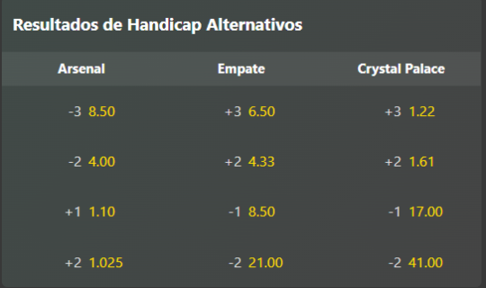 Pegue a imagem acima como exemplo. Veja que Arsenal -3 tem cotação superior que Arsenal -2, pois é mais fácil o Arsenal vencer por pelo menos 3 gols de diferença (-2) do que por 4 gols de diferença (-3). Do mesmo jeito, Crystal Palace +3 tem cotação menor que Crystal Palace +2.