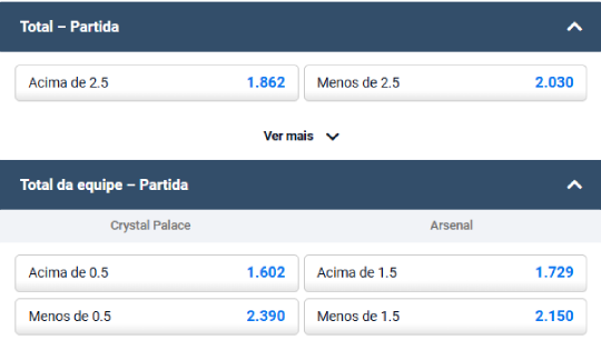 A imagem acima é de um jogo entre Arsenal x Crystal Palace. Há dois mercados, um de Total – Parida, em que se aposta no total de gols da partida, e Total da Equipe – Partida, em que se aposta na quantidade de gols de determinada equipe na partida. Vejamos: